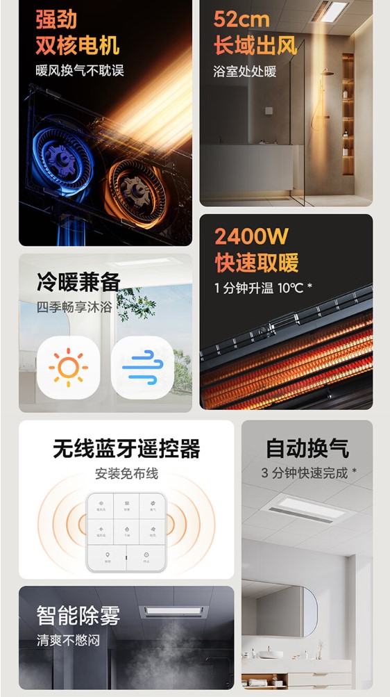 米家智能浴霸选用了PTC陶瓷制热模块,功率高达2400W,可实现1分钟升温10℃,让温暖片刻就来。寒冷季节下班到家,马上能洗热水澡。它还支持手机远程操作,用户可以在手机上提前开启加热,到家即可享受温暖沐浴;另外,它还可联动温湿度传感器,从而实现自动开关吹风/除雾/干燥等功能模式。