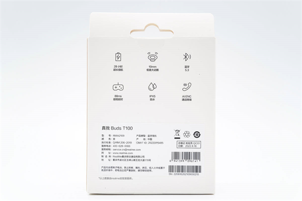 配置功能方面,蓝牙5.3、游戏模式、10mm低音大动圈、AI ENC智能通话降噪功能、28小时长续航、快充功能、IPX5防水和专属App等各项实用功能特性都是真我Buds T100“花哨”外观背后的真材实料,可谓是好看又好用。