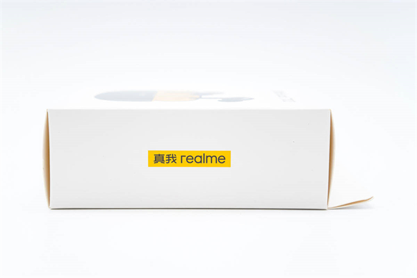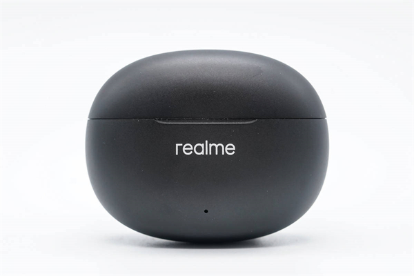 充电盒正面一览,开盖处设有凹槽,便于开启;中间是真我品牌Logo,下方是指示灯。