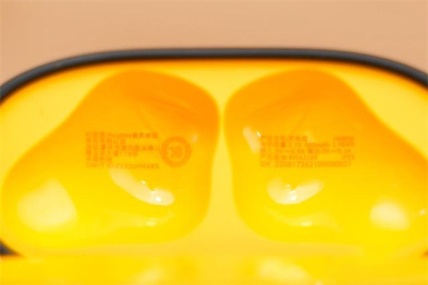取下耳机,可见上盖内侧丝印信息,主要有电池容量:400mAh/1.48Wh,输入:5V0.5A,输出:5V0.1A。