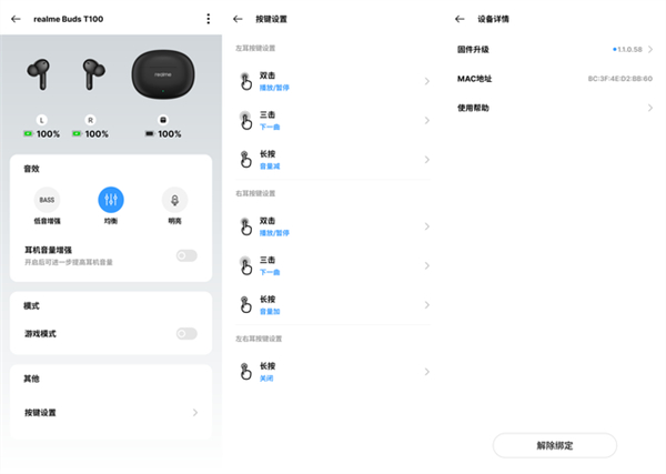在realme Link App中,用户可查看设备状态和电量、调节音效、设置音量增强、开关游戏模式、自定义按键设置以及升级固件,让设备更符合自身的使用习惯,用起来更顺手。