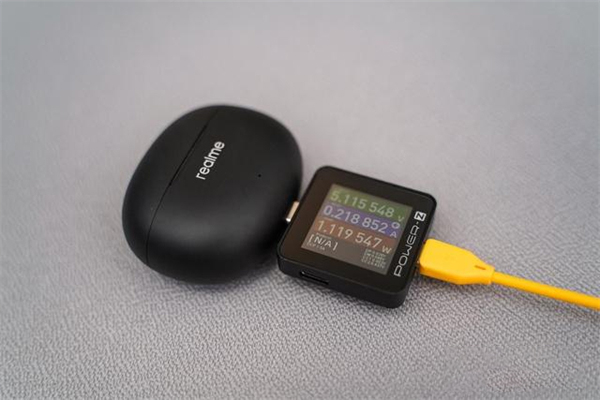 采用CHARGERLAB POWER-Z KM002C对真我Buds T100进行有线充电测试,充电功率约为1.12W。真我Buds T100耳机单次续航可达6小时,充电盒可以额外提供22小时的续航,综合续航最长可达28小时,算是比较耐用,同时支持快充功能:充电十分钟,听歌两小时。