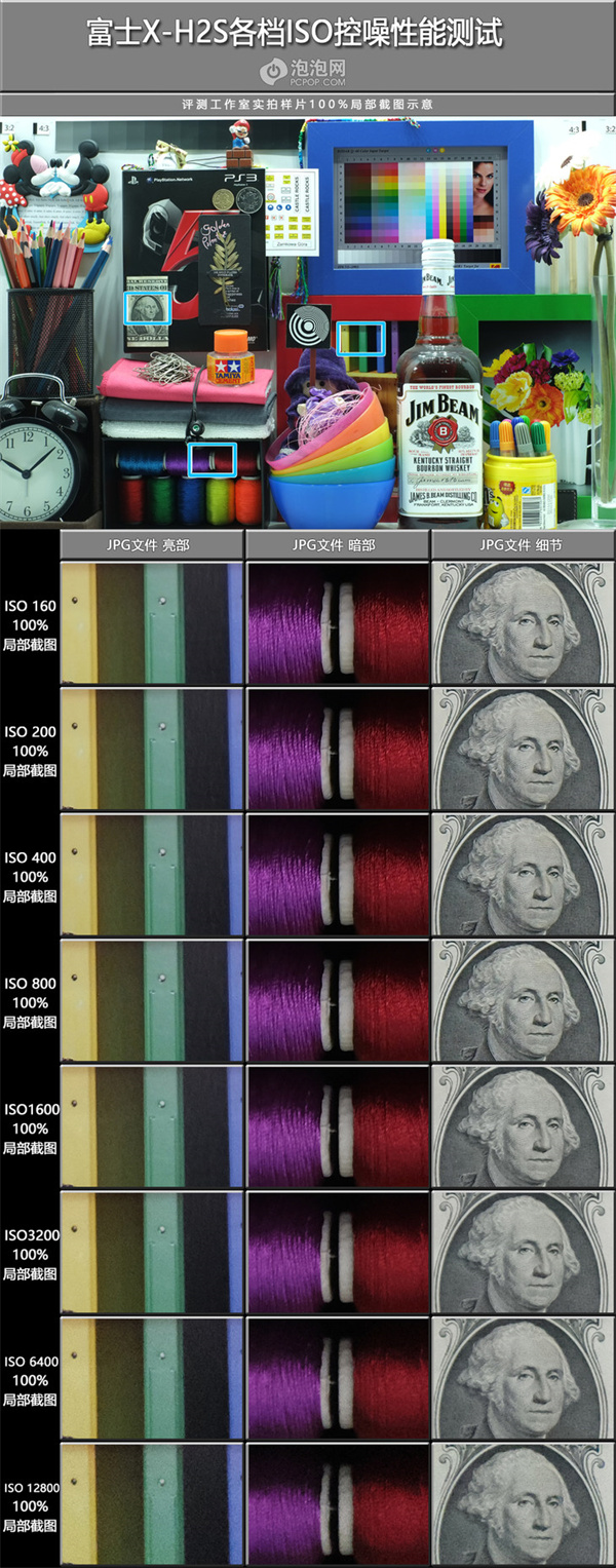 从上面的截图对比来看,富士X-H2S无反在ISO 400以下时画面都非常纯净。而从ISO 800时也并没有任何明显噪点出现;从ISO 1600-ISO 3200开始相机的画面细节略有下降,但仍然属于可用范围;ISO 6400以上乃至ISO 12800虽然画面偏肉不再锐利,但也没有明显的模糊或者噪点杂色出现。对于APS-C画幅的机型来说,可见这块堆栈式CMOS的高感表现还是很不错的。