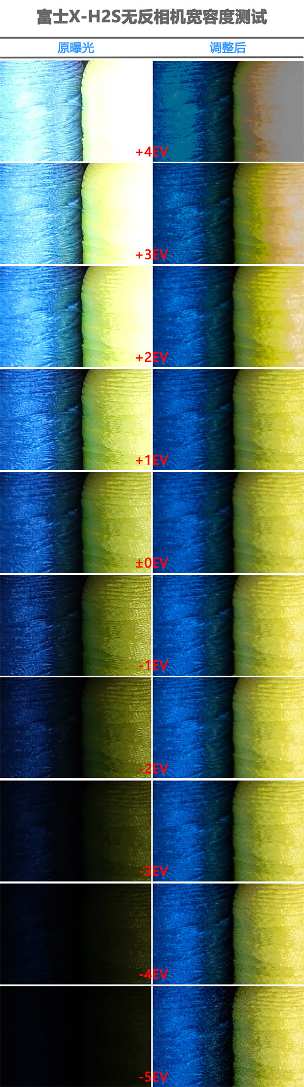 接下来,我们再来看看富士X-H2S在宽容度方面的表现如何。测试时我们为X-H2S设置为光圈为F8,ISO100,关闭相机所有校正及优化功能,使用RAW格式在+4EV、+3EV、+2EV、+1EV、0EV、-1EV、-2EV、-3EV、-4EV、-5EV曝光补偿下进行拍摄,并使用最新版Adobe Camera Raw软件将文件拉回至标准曝光(0EV,无降噪处理),RAW文件在拉回至标准曝光后转为JPG文件,并且截取100%放大局部进行对比。
