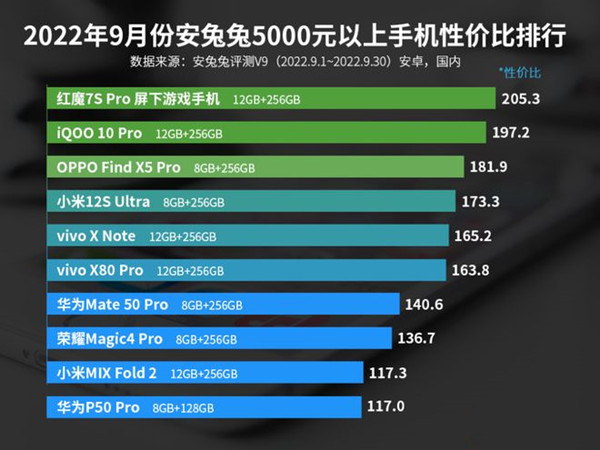 现在国内手机厂商都在冲击高端市场,而高端也就意味着价格会比较高。从价格上来看,5000元以上在国内已经算是高端手机了。近日安兔兔公布了2022年9月份5000元以上手机性价比排名。下面一起来看看榜上有名的都有哪些机型。