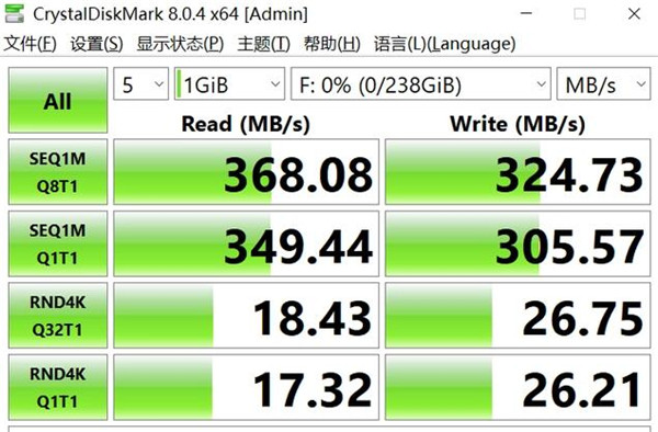 对于UFSD-C快闪U盘的速度方面,我这边也使用CrystalDiskMark8.0.4进行了测试,由于电脑的接口是3.0接口速度测试读取的速度在368MB/s,写入的速度在324.73MB/s,与官方速度差不多,不过如果你的电脑接口为3.2的话会更快。个人觉得整体表现还是在预期之内的。