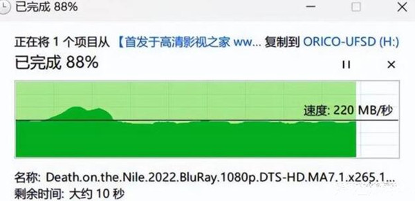 在实际的文件传输过程中,传输整个10G的文件来说速度是非常稳定的,全程200M以上的传输速度。在传输零散文件数据会有部分波动,不过并不是非常的明显,大文件10几秒完成,办公很轻松。