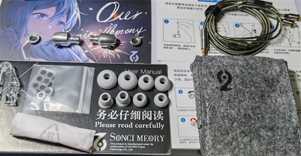 耳机本体、标配后盖、标配线材、白耳套一袋、红蘑菇套一袋、滤网两板、备用滤网盖一对、mmcx拆拔器一个、耳机包一个、废纸4张。
