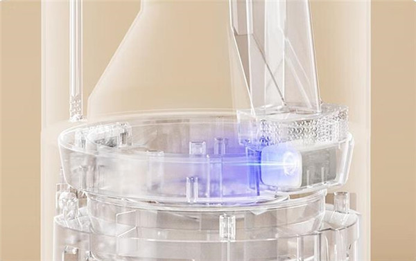 我们可以选择使用水壶从顶盖中心或者边缘格栅上方给水箱加入适量水,通电开机后,水位灯自动亮起,灯光照射水面,折射出明亮液面,即使在暗光环境下,水位依旧清晰。