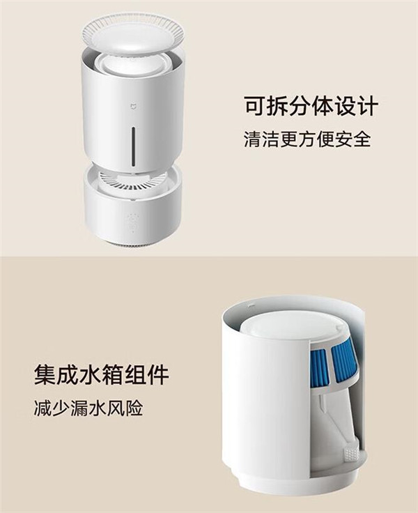 米家纯净式智能加湿器 2 Lite采用可拆分体设计,分为:顶盖、水箱、主机底座三部分,水箱将滤芯、过滤网与水箱采用集成设计,减少漏水风险,水箱正面还有一个水位视窗。