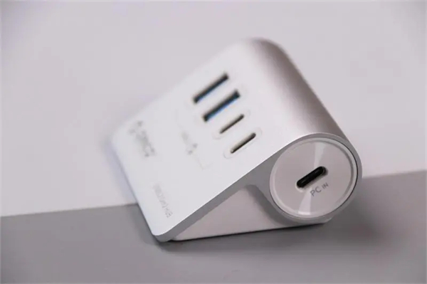 从侧面看它是一个呈34°仰面的设计,这个倾斜角度在插拔外设时最舒适。在左边的侧面是它的5V供电口,可外接电源,确保大功率USB设备稳定运行,有闪电的标识。而在它的右侧侧面,则是它的数据输入口,有PC IN的字样。这两个插口均是Type-C接口,使用起来非常方便。