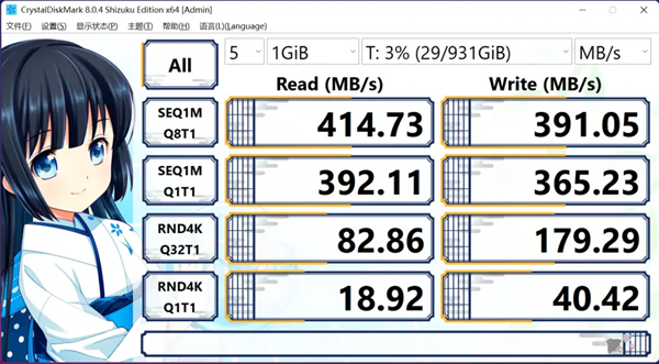 随后又测试了一款雷克斯的固态移动硬盘,读取为414MB/s,写入为391MB/s,这个速度索然没有跑满速,但是对于一款分线器来说这个成绩也很优秀,日常使用足够了。