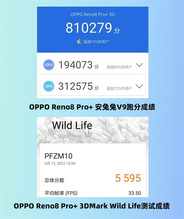 在基准性能测试中,OPPO Reno8 Pro+取得了安兔兔V9跑分81W分的优异成绩,并且在3DMark Wild Life测试中也取得了5595分的优秀成绩,整体性能表现与旗舰手机相当。