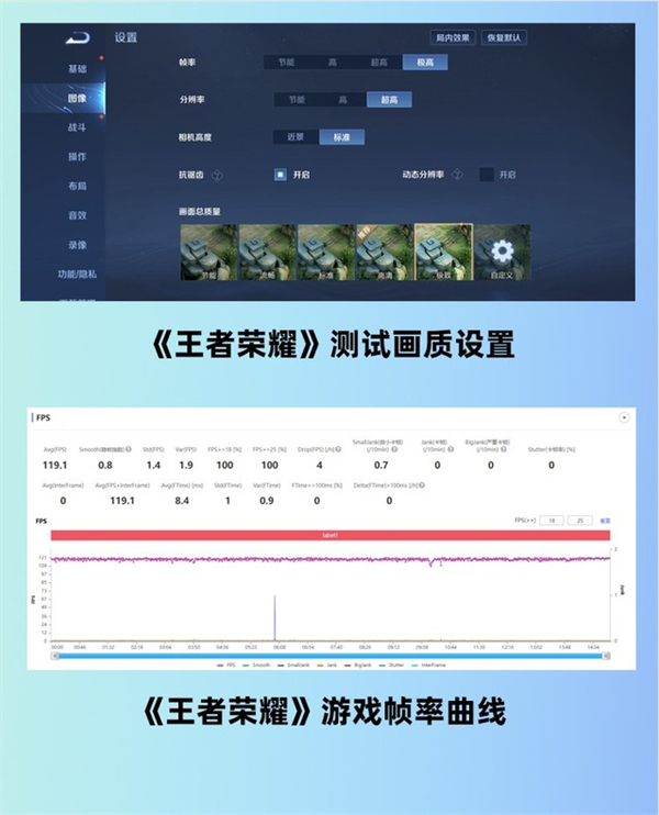在了解完OPPO Reno8 Pro+的性能配置之后,我们便进入游戏实测环节。我们首席选择了玩家较多的国民级手游《王者荣耀》进行测试,在压力极大的120帧模式下,OPPO Reno8 Pro+ 实测平均帧率为119.1帧,帧率曲线波动极小,全程没有出现大幅度降帧现象,帧率表现丝毫不亚于游戏旗舰手机。