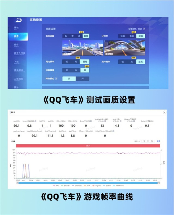 竞速类游戏和竞技类游戏一样对于游戏画面帧率有着较高的要求,在知名手机竞速游戏《QQ飞车》的实测中,我们开启了超高画质+超高帧率模式进行测试,OPPO Reno8 Pro+的实测平均帧率为90.1帧,全程高帧畅玩无压力。