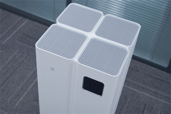 米家全效空气净化器Ultra顶部配备四个风扇格栅,没有任何物理按键,净化器的所有功能均通过显示屏或APP进行操控。