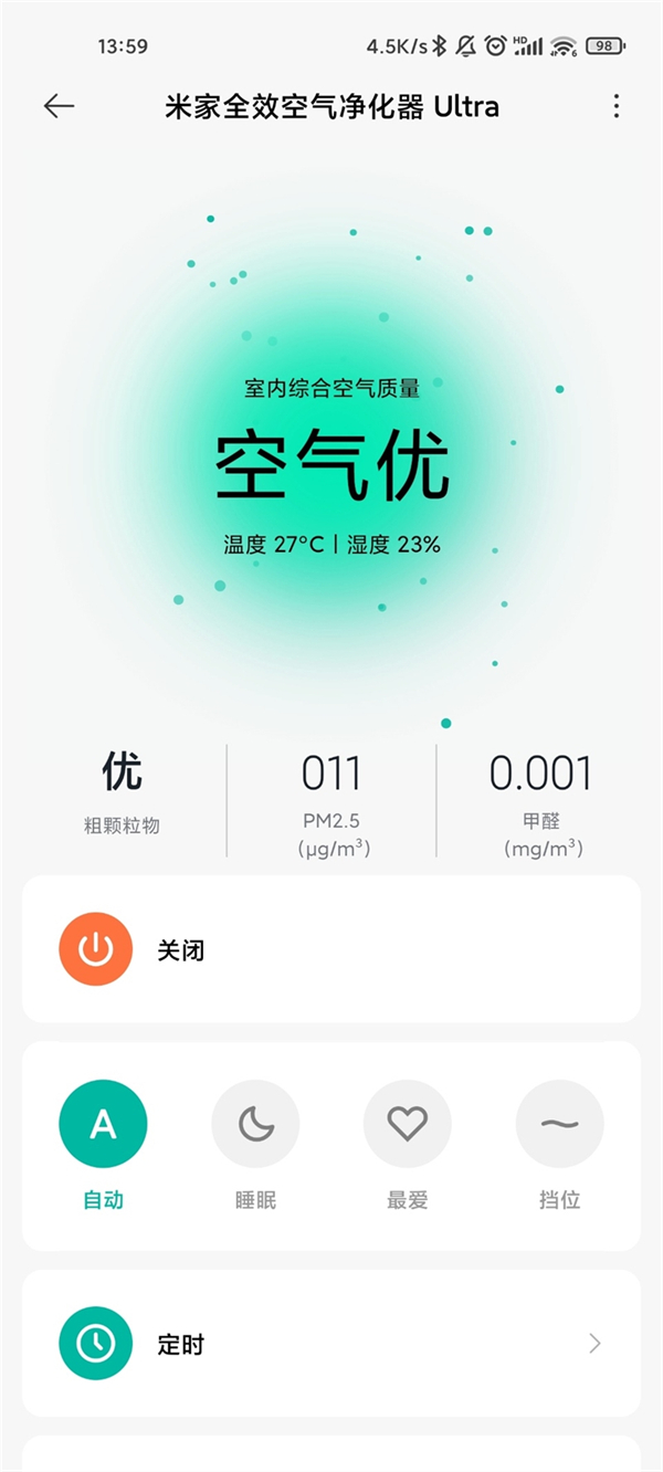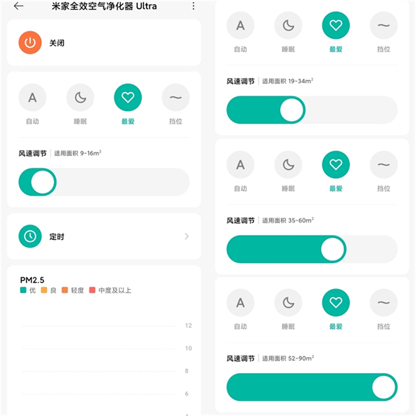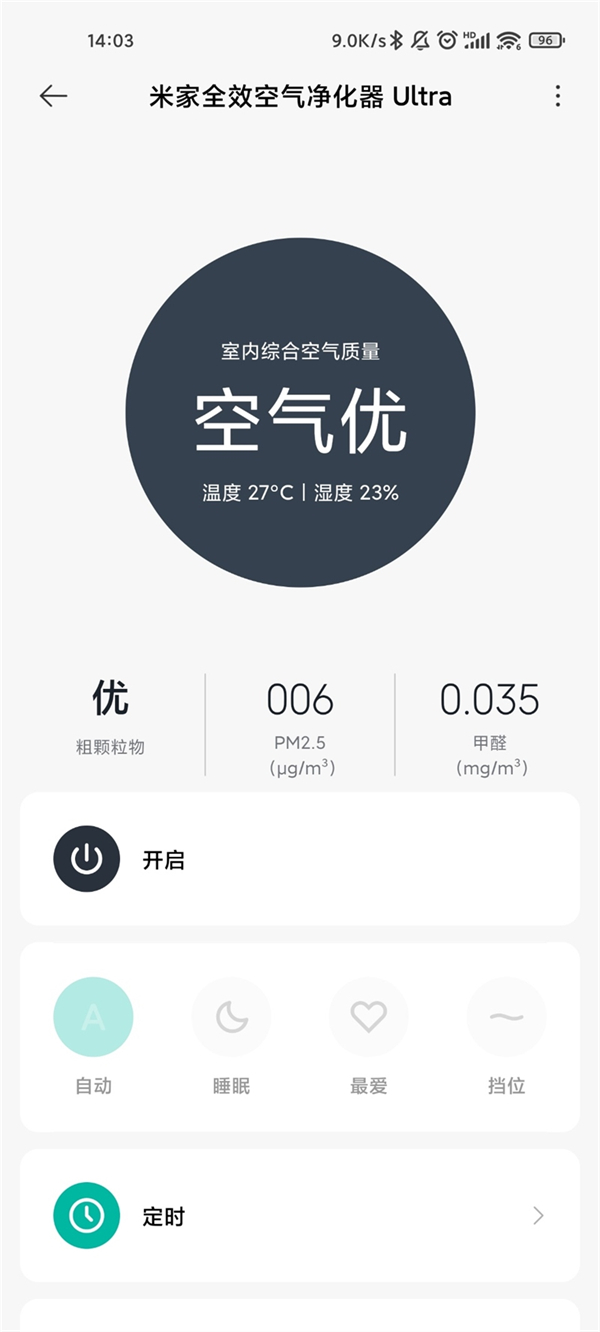 当米家全效空气净化器Ultra开启后,通过APP我们可以远程操控净化器的档位以及进行定时操作。