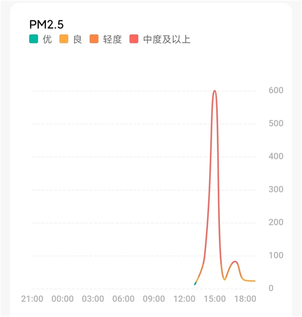在APP内,我们可以看到当前环境的PM2.5/PM10(粗颗粒物)以及甲醛含量的实时变化情况。