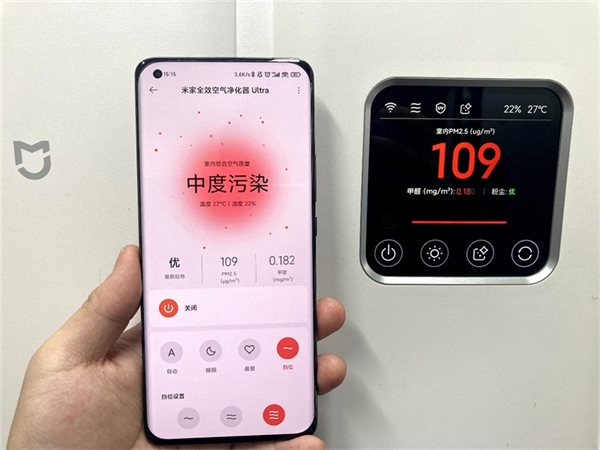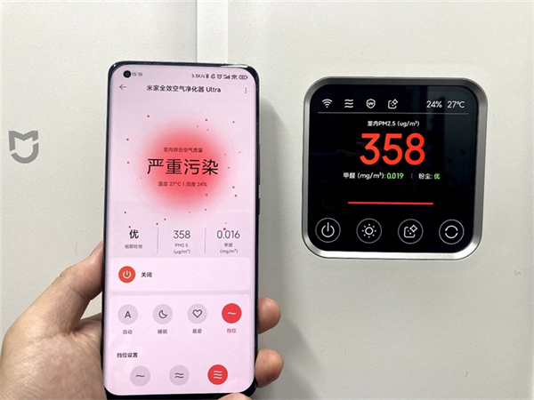 我们开启三挡测试,经过5分钟的净化,PM2.5浓度从358μg/m³的严重污染降至109μg/m³的中度污染,可以看出米家全效空气净化器Ultra的净化能力还是非常显著的。
