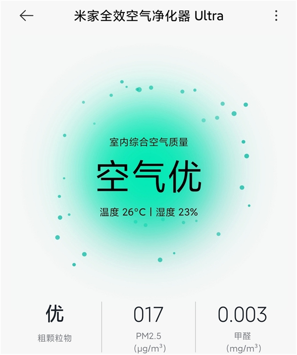 国家对于室内甲醛浓度定义的标准值是0.1mg/m³,而️使用米家全效空气净化器Ultra清洁后的甲醛浓度达到0.003mg/m³。