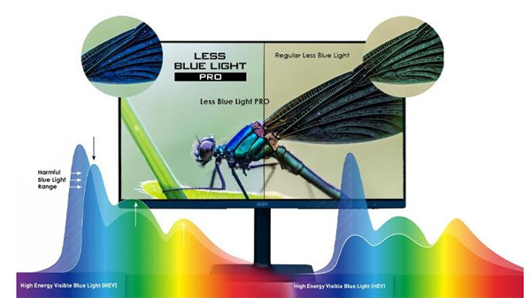 作为针对商用显示器,微星MD272QP Ultramarine提供了TUV认证的不闪屏技术,全新升级的滤蓝光Pro技术,更智能护眼。可以看到开启防蓝光后,屏幕画面变化非常显著。长时间使用也能有效减轻用眼疲劳。