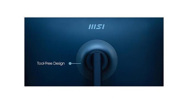 显示器底部边框的右侧下方位置设置了5个实体按键和一个状态指示灯,并在正面标准了功能标识,可以非常便捷的进行调整。背面设计也非常的简洁,弧形的线条配合喷砂工艺处理的外壳有着非常不错的质感,在不同的光线下,会有立体的视觉表现。背部的正上方有MSI的标识,支架的圆形接口采用金属材质,不仅牢固而且进一步增加了层次感。