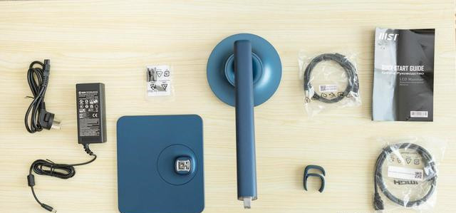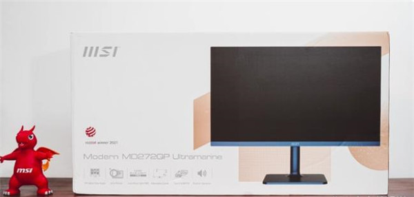 微星MD272QP Ultramarine这款显示器的包装已经进行了升级,采用了彩盒印刷包装,正面可以看到显示器的实物展示和各类特性标识,醒目位置可以看到红点设计大奖的红色标志。配件方面,除了屏幕,还提供了底座,支架臂,外置电源,VESA延长螺丝,数据线,理线器和说明书等。