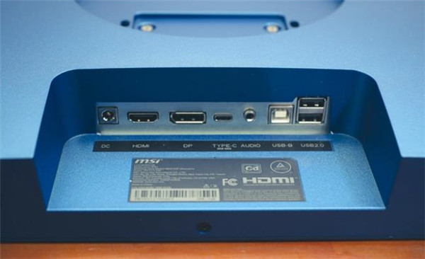 显示器的接口位于背面底部, 采用了外置电源设计,通过一个DC圆孔供电。其他接口包含了一个HDMI,一个DP,一个TYPE-C(65W反向供电),3.5mm耳机接口,一组USB2.0和上传接口,扩展性和易用性都不错,可以轻松的连接多台设备使用。