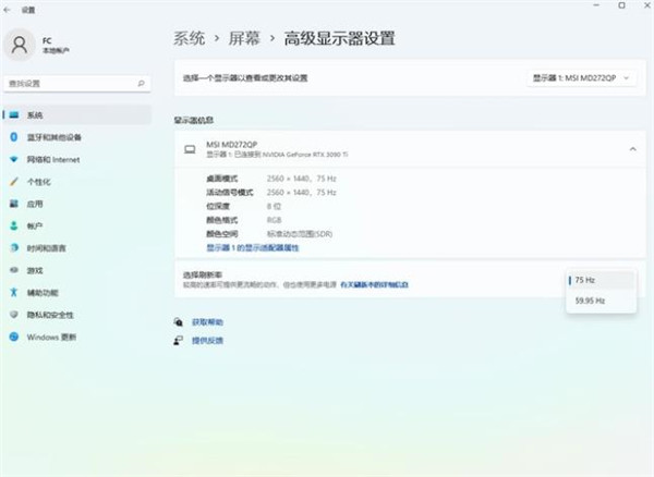 微星MD272QP Ultramarine的刷新率在默认状态下是60Hz,在设置菜单中可以调节到75Hz使用。显示器的操控按键位于显示器的右侧底部,5个实体按键配合1个指示灯,单手可以轻松操作,布局合理,手感清晰,设计的非常人性化。