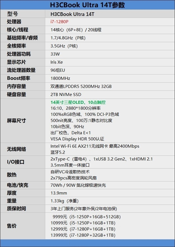 新华三H3CBook Ultra 14T详细参数配置如下: