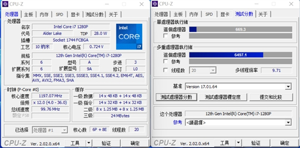 i7-1280P的单核分数是669.多线程分数是6497.