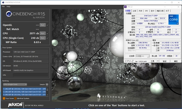在CineBench R15测试中,i7-1280P的单线程分数为240cb,多线程成绩为2071cb。