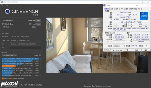 CineBench R23单核1674pts,多核11044pts。