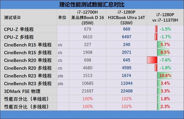 通过对比发现,i7-1280P不论单核性能还是多核性能都略强于i7-12700H处理器,特别是在️CineBench R23这样长耗时的测试中不论单核性能还是多核性能都获得了领先,从这里也能看出H3CBook Ultra 14T拥有非常稳定的性能释放。