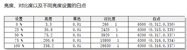 这是SDR模式下的亮度测试,最高亮度338nit,对比度26630:1.