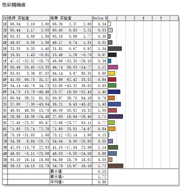 在色彩精准度方面。最高Delta E值是1.72.最低是0.15.平均Delta E值<1.