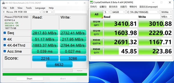 在AS SSD Benchmark测试中,这块SSD的跑分达到了6632分。
