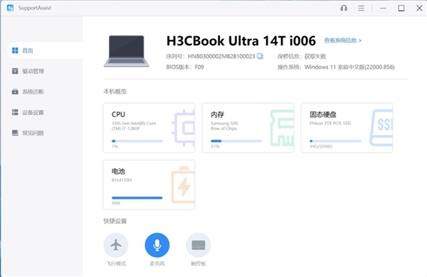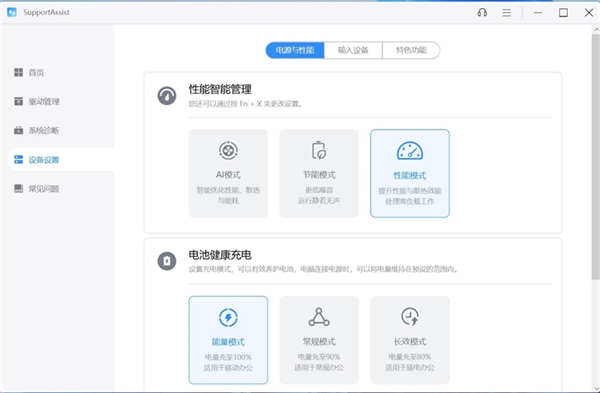 Support Assist 2.0可以提供驱动更新、问题诊断、自定义设备、常见问题查询等功能,并且也能直接切换笔记本的性能状态。