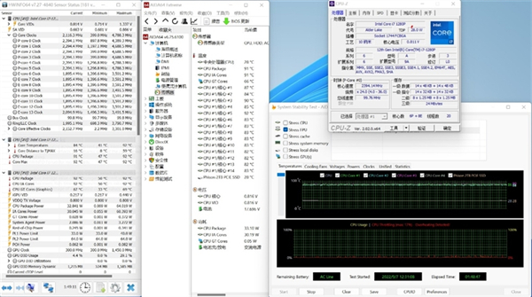 我们进行了长达近2个小时的烤机测试,i7-1280P的功耗一直稳定在33W的水准,P核全核频率2.4GHz,温度92度。