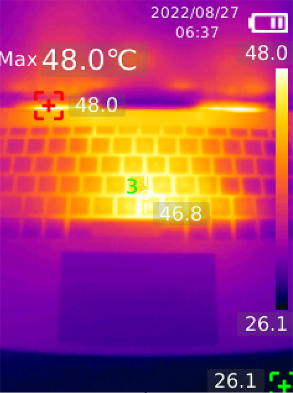 C面最高温度是46.8度,而热点是位于键盘中间很少接触的区域,符合人体工学体感。