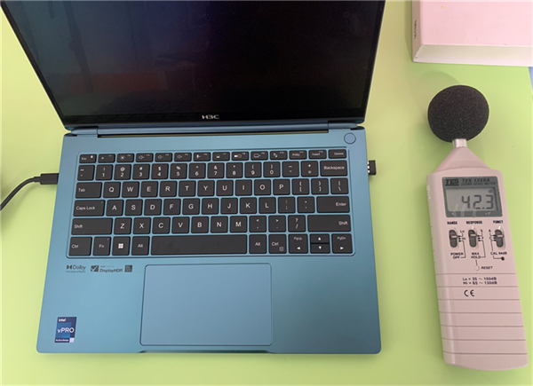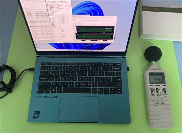 AI模式下进行烤机测试时,处理器的功耗维持在28W,在笔记本10cm距离内,测得的噪音为44.8分贝,只比环境噪音高了2分贝左右,基本上感受不到声音。