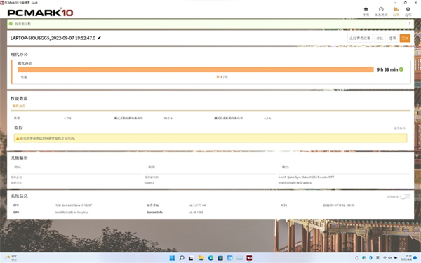 在PCMark 10现代办公场景下的续航测试成绩为9小时38分钟,对于普通用户来说,充满电一次可以满足1~2天的移动办公需求。