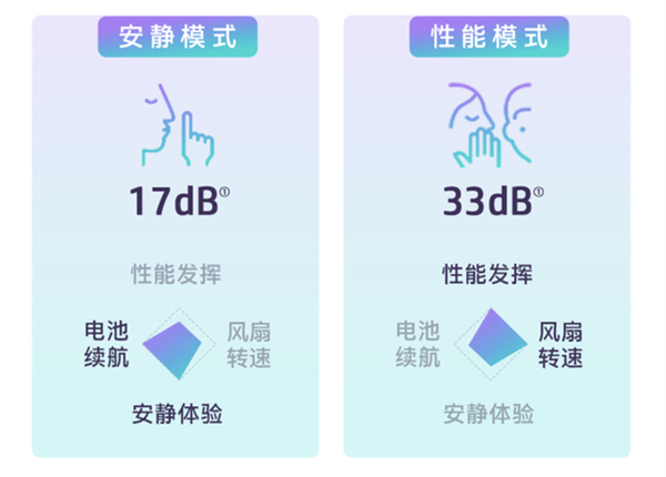 在安静模式下,创意本采用的是电池供电直流模式,此时运行声音小于17分贝具有极佳的静音效果;而在全性能模式下,创意本采用交流电源供电,但运行声音也不超33分贝,足以达到图书馆级的安静程度。