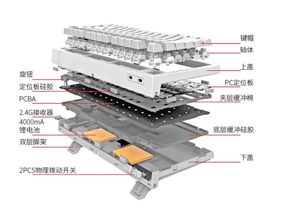 这款雷咖泽KW75客制化键盘采用的全部都是真材实料,真Gasket结构,从键帽、轴体、上盖、PC定位板、定位板硅胶、夹层缓冲棉、PCBA、底层缓冲硅胶、下盖,一层一层满足你对任何一层结构的需求和渴望。