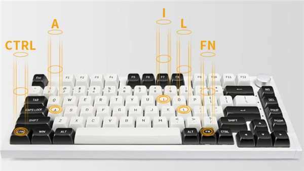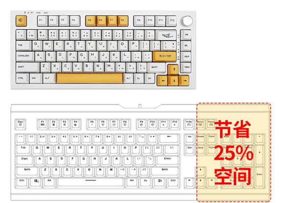 雷咖泽KW75客制化键盘是一款采用了75%配列布局的键盘,而且做了方向键的分离,同时的话也是在键盘的右上角采用了旋钮的设计,此外的话键盘的右侧也单独做了一下设计,增加了一些纹理的设计。
