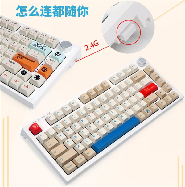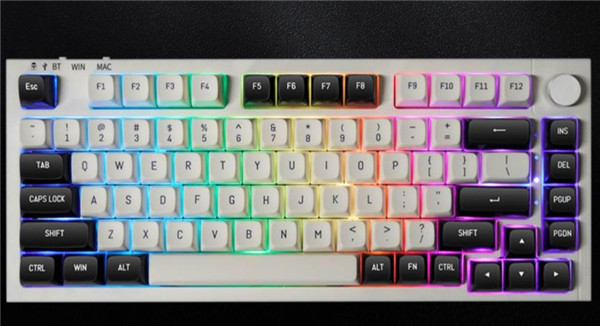 雷咖泽KW75客制化键盘支持BT蓝牙连接、2.4G无线连接以及有线连接,并且还支持Mac模式和Win模式,当然,键帽里也配备了不同操作系统常见的功能键。