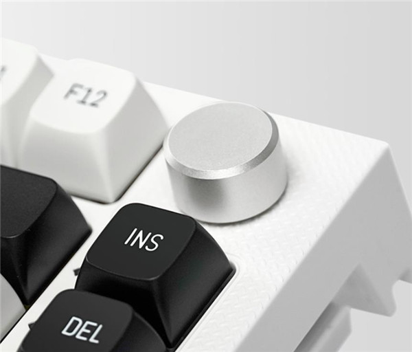 这款键盘的个性之处在于右上角有一个专用的合金音量旋钮,你可以用它来快速调节音量,单击还可以切换到RGB发光亮度,这个就很超级实用。