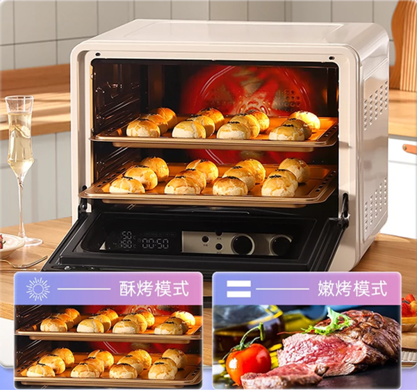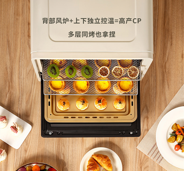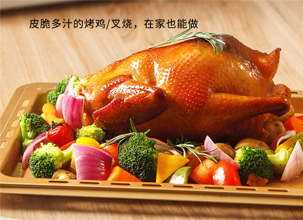 能多层同烤,单次能同时烘烤40个蛋黄酥、柠檬片80片、杯子蛋糕40个、6寸戚风6个、鸡翅60个、泡芙48个,烘焙高效。高密度镂空烘干网采用了食品级镀铬处理,耐腐蚀,烘干果如日晒;金色烤盘采用了耐高温搪瓷涂层,质量升级、不粘盘,易清洁;配件工艺精湛,细节尽显匠心独运。