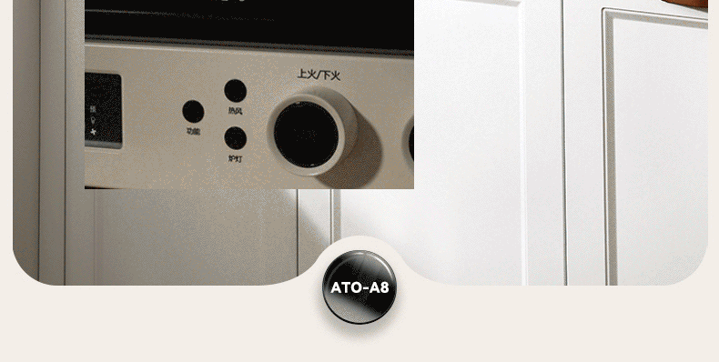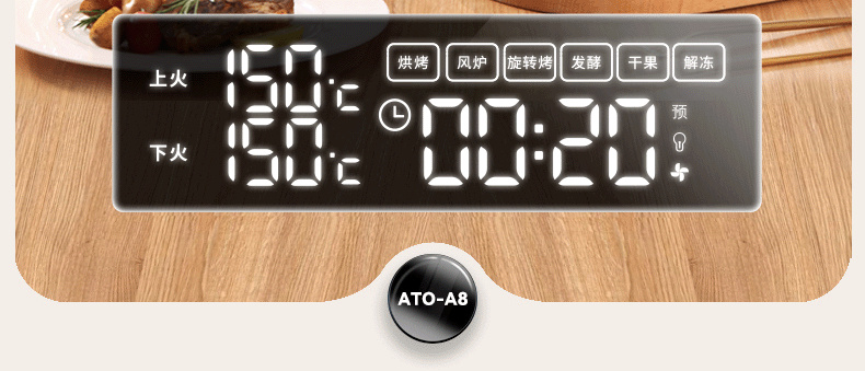 ACA风炉烤箱A8正面下方是操作面板,一块LED高清大屏,功能、状态显示一目了然。实体按键+无极旋钮,电子式操控,烘焙模式、温度、时间都能精准控制。