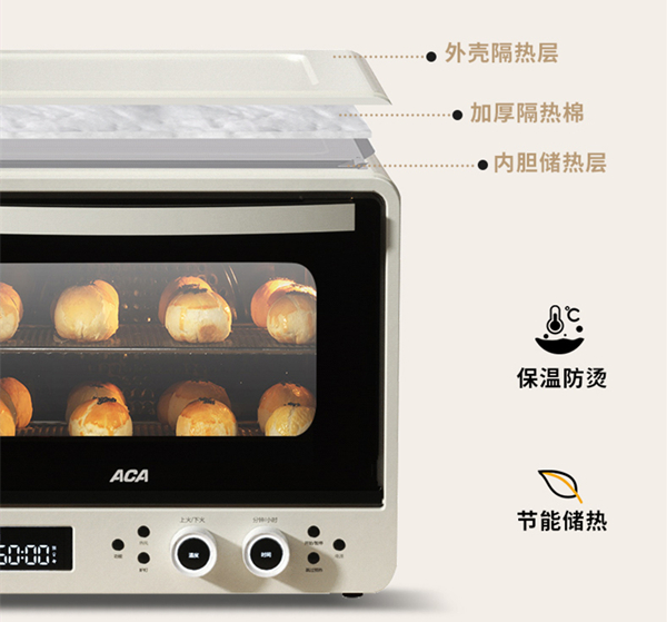 ACA风炉烤箱A8的双侧加厚隔热透明玻璃门真是加分项,内层聚能储热、稳定温场,降低能耗,外层防爆加固更加安全,中空隔热。开启、关闭都有一定的阻力,配合着烤箱里的贴心炉灯,能够时刻见证美食的蜕变。